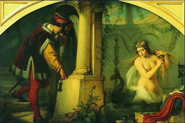 One day, Raymond’s brother visited him and made Raymond very suspicious about the Saturday activities of his wife. So the next Saturday, Raymond sought his wife, finding her in her bath where he spied on her through a crack in the door. He was horrified to see that she had the body and tail of a serpent from her waist down. He said nothing until the day that their son, Geoffrey-with-the-great tooth, attacked a monastery and killed one hundred monks, including one of his brothers. Raymond accused Melusine of contaminating his line with her serpent nature, thus revealing that he had broken his promise to her.