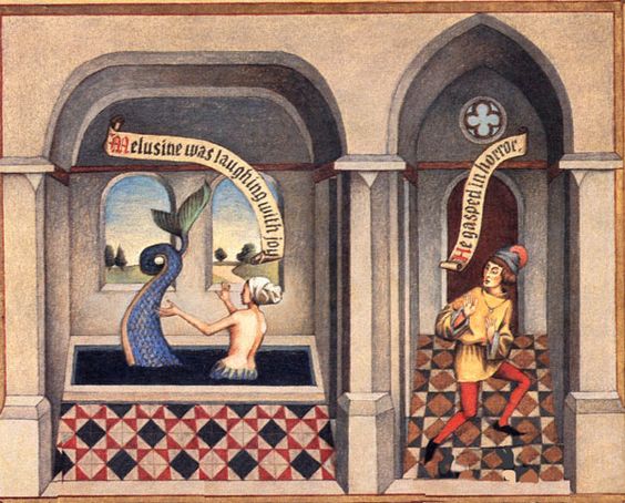 One day, Raymond’s brother visited him and made Raymond very suspicious about the Saturday activities of his wife. So the next Saturday, Raymond sought his wife, finding her in her bath where he spied on her through a crack in the door. He was horrified to see that she had the body and tail of a serpent from her waist down. He said nothing until the day that their son, Geoffrey-with-the-great tooth, attacked a monastery and killed one hundred monks, including one of his brothers. Raymond accused Melusine of contaminating his line with her serpent nature, thus revealing that he had broken his promise to her.