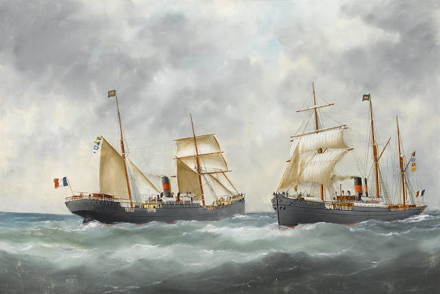 The younger Adam usually signed himself “Adam Fils” and was better known for his steamships painted in the first quarter of this century. Adam the elder, who was more prolific, specialized in sailing vessels, but painted steamers as well. He is often regarded as the French equivalent of the master American ship portraitist, Antonio Jacobsen and is noted for recording the crucial transition period of wind power to steam.