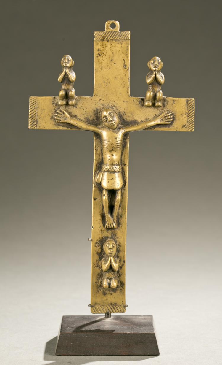 African crucifixes are the result of the adoption and almagmation of disperate relgious views. Christan iconography was first introduced to the African content in the 15th century by the Portuguese. By the early sixteenth century the king of Kongo was baptized and began a partnership with the king of Portugal. To reinforce his power and ties to the Catholic Church, prestige piece were made echoing Christian designs and symbolism. Piece are still made today that blend the traditions of African art with those of the Christian Church. More on African crucifixes