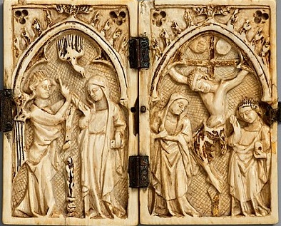 Late 14th century French carved ivory diptych with the Annunciation and the Crucifixion