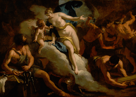 Venus, the goddess of love, looks down at Cupid. Venus went to her husband Vulcan’s forge and asked him to make arms for her son Aeneas.