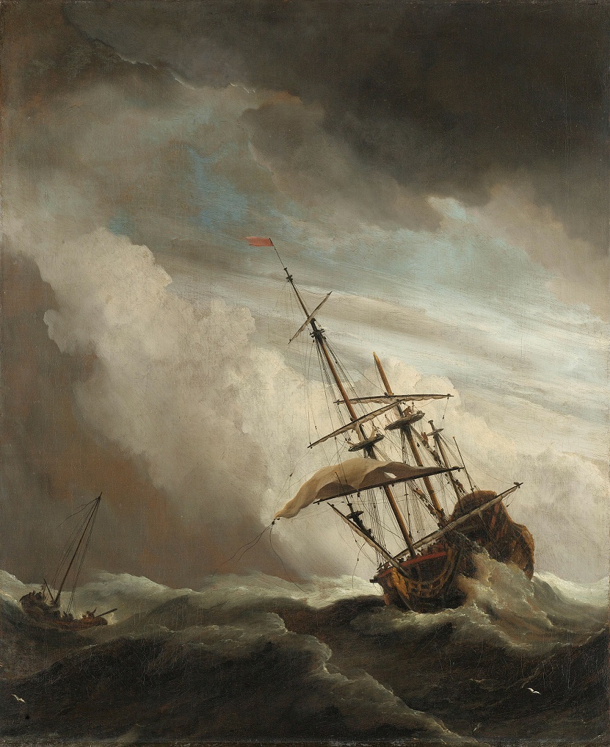 A large ship is in distress. A gust of wind broke the mast and one of the sails broke loose. It is a seventy-one British warship. Willem van de Velde II joined the English royal family in 1672, together with his father, who was also a marine painter. More on this painting