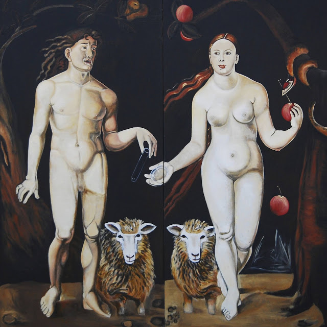 “I painted this painting during the time Dolly the sheep was cloned. I thought it made for interesting subject matter. This painting is special because I made all my own paints for this painting by hand, making the colours more vivid than usual. Adam Eve and Dolly took one year to paint while living in NYC. Painted on Belgium linen.