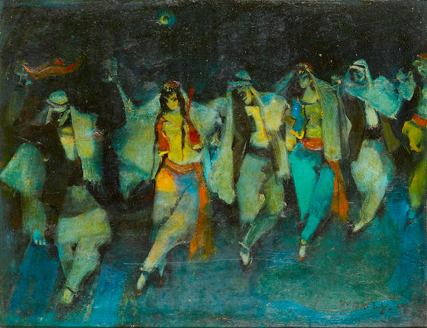 The dabka, literally ‘stamping of the feet’ is a type of line dance popular at weddings and celebrations throughout the Middle East. In Wanly’s work the figures are gracefully depicted, appearing almost to float across the canvas.