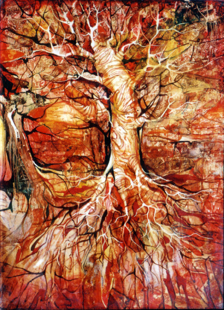 This vibrant work, by Suad al Attar, is electrified through the hyper-realistic rendering of a tree’s root system fanning out from the central trunk like lightning through the sky. The color scheme of intense reds and yellows contrasted with black adds to the visual vibrancy of the piece. More on this painting
