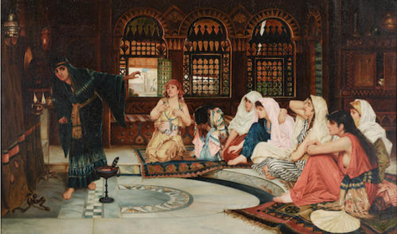 One of the finest examples of Sichel’s work is evident in The sorceress; here, the artist composed a picture of female figures in a Moorish setting, dressed in sensuous and dramatic attire. The artist’s depiction of the Eastern world is skillfully executed with varied patterns in the architecture, décor, carpets, and textiles, emphasized by his superior draftsmanship and adept brushwork. More on Nathaniel Sichel