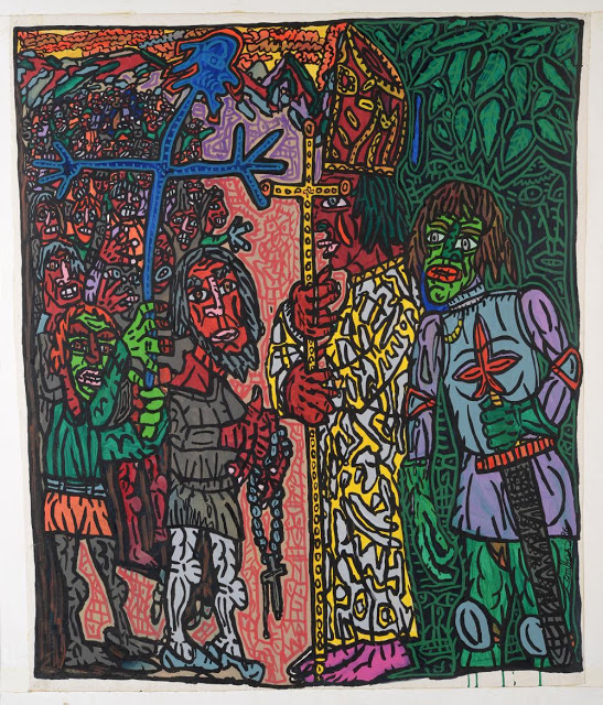 While Combas’ works often seem to carry an element of shock or confrontation, he insists the images are meant to engage the viewer, and their execution in vibrant color and bold, unfettered line communicate a spirit of proletarian camaraderie that offsets the tendency to overwhelm, in the larger works especially. More on Robert Combas