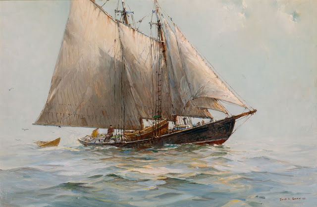 Jack Lorimer Gray was born in Halifax and studied at the Nova Scotia School of Art and Design (NSCAD). Though a traditional painter of marine pictures in a decade known for advances in abstraction in Canada, Gray’s paintings are avidly sought internationally. The appeal of his paintings has much to do with their authenticity and dynamism. Gray spent time at sea and was well-positioned to interpret in paint how vessels responded to the movement induced by wind and wave, unlike other marine painters who limited themselves to moored ships which they studied from dry land.