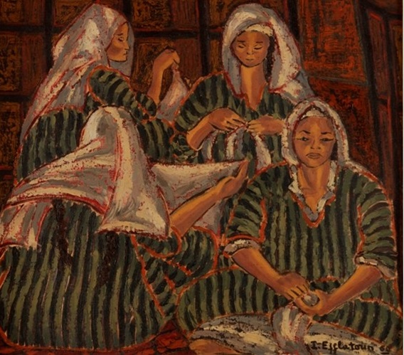 She was arrested and secretly imprisoned during Nasser’s roundup of communists in 1959. After her release in 1963, Egypt’s Communist party having been dissolved, she devoted most of her time to painting. She later declared: “Nasser, although he put me in prison, was a good patriot.”She was able to continue painting during her imprisonment. Her early prison paintings are portraits, while the later are landscapes. In the years after her liberation, she exhibited in Rome and Paris in 1967, Dresden, East Berlin, Warsaw and Moscow in 1970, Sofia in 1974, Prague in 1975, New Delhi in 1979. Her paintings are filled with “lively brushstrokes of intense color” reminding some observers of Van Gogh or Bonnard. Her art of later years is characterised by an increasing use of large white spaces around her forms. A collection of her works is displayed at the Amir Taz Palace in Cairo. More on Inji Aflatoun
