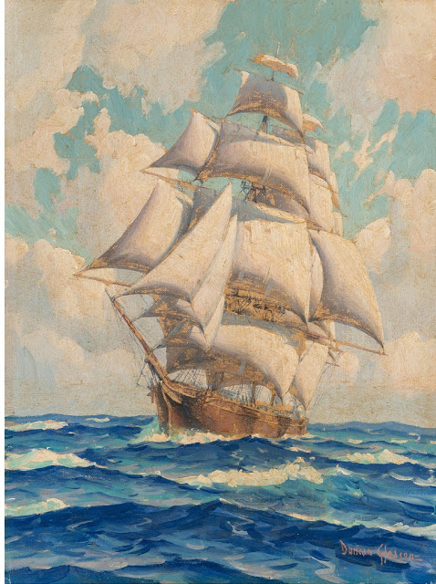 For Joe Duncan Gleason, (1881 – 1959 Glendale, CA) It was boating – and life on the sea, in general – that steered the motley professions and avocations of the California painter Joe Duncan Gleason. Trained at the Chicago Art Institute and the New York Arts Students’ League, he illustrated for various magazines, including Leslie’s Monthly, Ladies Home Journal, and Forecast, from 1903 to 1914; during this period, while competing as a gymnast in national competitions, he acquired a 36-foot yawl and sailed often on Long Island Sound. Gleason’s earliest paintings are Impressionist in style and depict the scenic hills of his childhood Los Angeles as well as the peopled shores of nearby Laguna Beach. A brief return to New York from 1919 to 1924 inspired Gleason to take up marine painting, model shipbuilding, and writing about sailing: he published Windjammers, a book of etchings (1922), followed later by Islands of California (1950). In the mid-1920s, Gleason established his studio in the harbor town of San Pedro, California, and began consulting for Metro-Goldwyn-Mayer and Warner Bros., providing visual guides for the ships that appeared in such films as Yankee Clipper, Captain Blood, and The Charge of the Light Brigade. When not painting or lecturing on historical ships, he was sailing, both with the U.S. Coast Guard Auxiliary during WW II and recreationally with the California Yacht Club.More on Joe Duncan Gleason