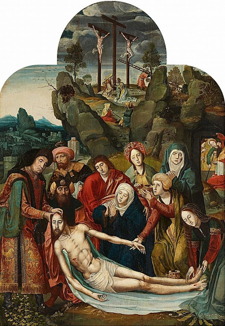 This work depicts several scenes taking place simultaneously: In the background we see Christ’s deposition from the cross on Mount Calvary whilst His body is anointed in the foreground. Nicodemus and Joseph of Arimathea hold Christ’s body whilst Mary Magdalene kneels ready with the ointment jar at his feet. The Virgin is shown in the centre of the work supported by Saint John. The grave is prepared on the right edge of the image and in the background we see the silhouette of the city of Jerusalem. More on this work
