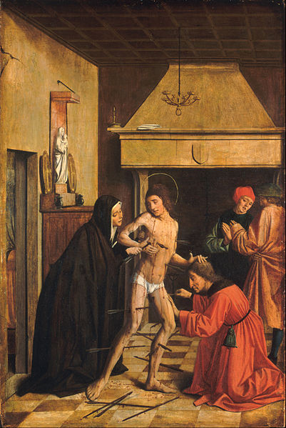 Saint Sebastian (died c. 288 AD) was an early Christian saint and martyr. Sebastian had prudently concealed his faith, but in 286 was detected. Diocletian reproached him for his betrayal, and he commanded him to be led to a field and there to be bound to a stake so that archers from Mauritania would shoot arrows at him. “And the archers shot at him till he was as full of arrows as an urchin is full of pricks, and thus left him there for dead.” Miraculously, the arrows did not kill him. However, Irene came to bury the body and found that he was not quite dead. Irene took him to her lodgings and nursed him back to health
