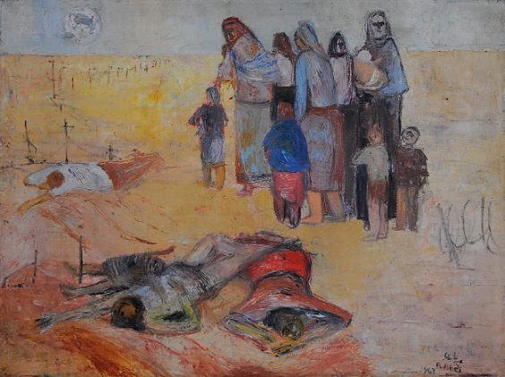 Palestinian art history is largely characterized by fragmentation, both in style and content, which is a result of ongoing wars and displacement of people. Despite historical ruptures in time and space, artists have flourished in a multitude of voices and places to create a vibrant Palestinian art scene. The featured works by Abed Abdi re archetypal of Palestinian art in the aftermath of war, reflecting unique and distinct styles expressing the broad struggles and experiences of the Palestinians. More about this painting