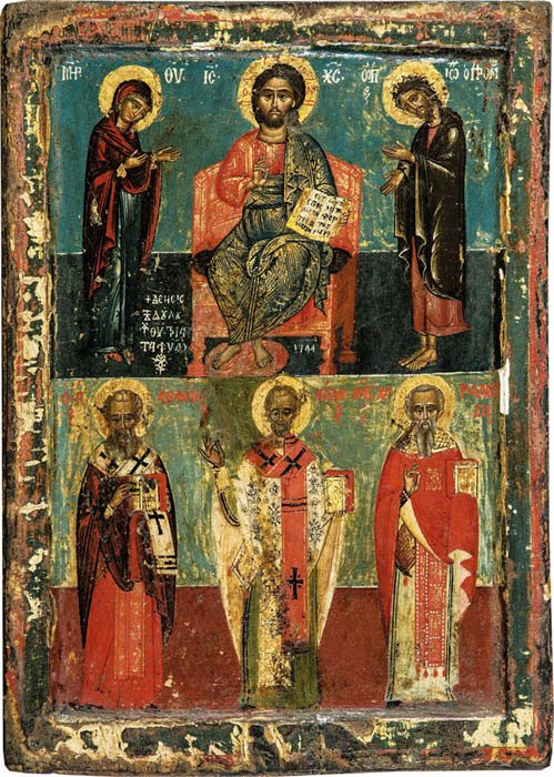 An icon painted in two registers. Greece, c. 1744. Heavy Softwood single panel. Egg tempera on gesso (gypsum), Konturritzungen, partially gilded. In the upper frame a full figure enthroned Christ flanked by the Virgin Mary and John the Baptist. The underlying three selected saints: St. Athanasius, St. Nicholas and St. Charalampi…. The upper frame is dated ‘1744’ ‘