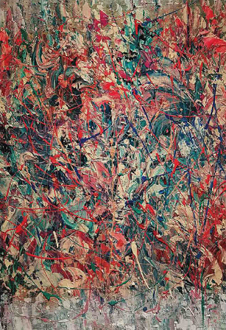 “There is no pre-conceived vision. Maybe, on occasion, I may have a burning issue that I would like to address. But more often than not, I start blank. I stand in front of a pure, white canvas and it mirrors my state of mind. I let my subconscious take control and I let rip. Every daub of color, every layer finds a life of its own. The intricate network of lines and specks, and subliminal shapes leave the complex nooks and crannies of my mind and happily pick their spot on the canvas.” Sheeba Khan