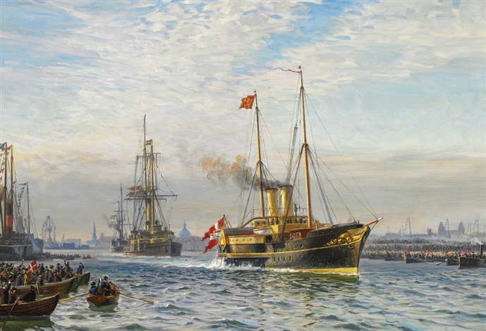 Wilhem Karl Ferdinand Arnesen (Danish, 1865-1948). Arnesen’s father was a skipper and a builder of model ships developing Arnesen’s interest for maritime at a very young age. Later when Arnesen was educated at the Academy of Arts he was given the highly esteemed honour to accompany the Danish Royal family on their many travels abroad. Arnesen was known for his detailed and powerful seascapes with large sail ships and often portrayed famous historical events. Arnesen traveled and worked all around the world and his paintings were in high demand. Arnesen is known to be the last of the great old national marine artists. The paintings of Arnesen have been exhibited at the world fair in Chicago , Museum of Arts in Lübeck , Germany and frequently at Charlottenborg.
