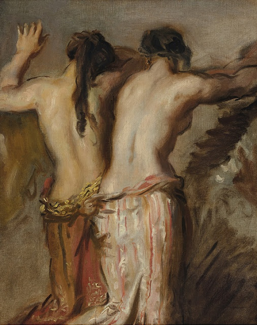 After Ingres left Paris in 1834 to become director of the French Academy in Rome, Chassériau fell under the influence of Eugène Delacroix, whose brand of painterly colorism was anathema to Ingres. Chassériau’s art has often been characterized as an attempt to reconcile the classicism of Ingres with the romanticism of Delacroix. He first exhibited at the Paris Salon in 1836, and was awarded a third-place medal in the category of history painting. In 1840 Chassériau travelled to Rome and met with Ingres, whose bitterness at the direction his student’s work was taking led to a decisive break.