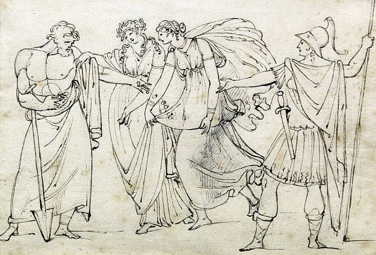 Neo-classical study of two maidens ushered into the presence of a bearded man