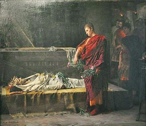 Octavian’s war against Marc Antony and Cleopatra brought him to Egypt, where the latter two took their own lives while under siege in 30 BCE. After Octavian’s victory over his two deceased rivals, he stayed behind in Egypt to shore up his control over the region, and to do some sightseeing — including, as seen above, a visit to the tomb of Alexander the Great. More on this painting