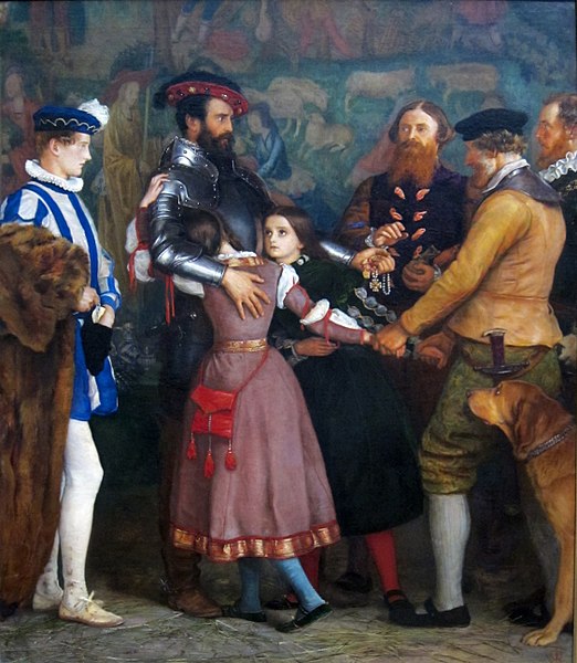 An armored knight, still in his riding boots and accompanied by his page in mud-splattered stockings, seems to have hastily gotten off his horse to meet for this ransom exchange. The knight’s daughters embrace him while he tries to hand over precious jewels, but their arms are still being held by the kidnapper, whose plainer clothing contrasts with their finery. The page in a blue and white striped ensemble is watching closely and reaches into his purse, sensing that the kidnappers will demand more ransom. These characters — not based on any historical or literary source, but invented by the artist — dramatize a narrative through their expressive gestures and glances. The outcome still seems uncertain and even the dog looks expectantly at the central figures for the resolution of the story. More on this painting