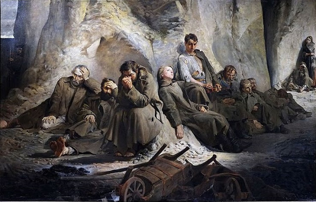 Sunday in the Mine from 1882 is one of many paintings by Jacek Malczewski — realistic, symbolist, expressionist — devoted to the martyrdom of Polish exiles, including participants of subsequent national uprisings, in Siberia. The Siberian series painted by Malczewski in the years 1877–1895 includes scenes from stages, prisons, mines and places of exile.