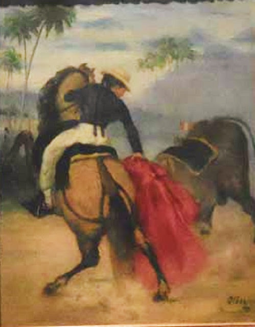 Oller’s earliest surviving European painting, below, evinces the duality informing much of his work: It depicts a woman bullfighter in Madrid — an anomaly in a male-dominated field, incongruously placed in a Caribbean setting. You could take the painter out of Puerto Rico, but you often couldn’t take Puerto Rico out of the paintings (palm trees, upper left), even in some that seem overly impressed by Impressionism. More on this painting