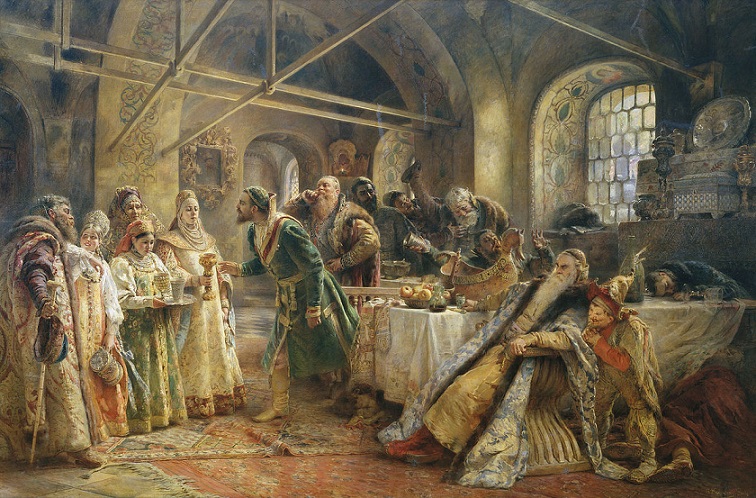In the painting, Morozov, the old man to the right with a long, white beard, is waiting to see the reaction of Elena when Romanchov kisses her. Romanchov is the man wearing a green tunic and leaning forward, while Elena is the pale, tall woman holding a large, golden goblet. As Morozov is frowning and tensely gripping the arm of his chair, his right hand rests dangerously close to a dagger. Next to him, a jester whispers devilishly into his ear, emboldening the boyar’s worst suspicions. More on this painting