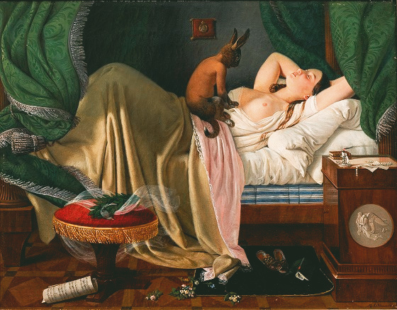Sex, euphoria and even life and death are all cast alongside one another in this nightmarish painting from 1846. A messy room is illuminated by the first morning rays of light. The clock hands show that it is past six in the morning and a four-poster bed’s dressing has become a stage curtain framing the piquant drama unfolding in this scene. A demonic incubi with the head of a hare, torso of a man and backside of a cat has entered through an open window and now sits on the lap of a young woman in deep slumber. The incubi has used one of its paws to pull down her white, see-through nightdress, revealing one of her breasts. The woman, still dreaming, does not exhibit any fear or distress at the presence of the grotesque creature. On the contrary; with her closed eyes, half-parted lips and relaxed body, she appears to be in a state of sensuous pleasure. Aroused, while not aroused from her deep slumber. More on this painting