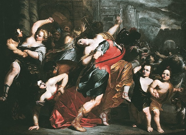 The Rape of the Sabine Women is an episode in the legendary history of Rome, traditionally dated to 750 BC, in which the first generation of Roman men acquired wives for themselves from the neighboring Sabine families. The English word rape is a conventional translation of the Latin raptio, which in this context means “abduction” rather than its prevalent modern meaning in English language of sexual violation. The story provided a subject for Renaissance and post-Renaissance works of art that combined a suitably inspiring example of the hardihood and courage of ancient Romans with the opportunity to depict multiple figures, including heroically semi-nude figures, in intensely passionate struggle. More on the rape of the Sabine women