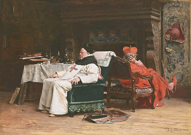The scene is set in the reception room of a rich monastery hung with old tapestries, and features a tall bald jovial abbot on the left, and a his companion the cardinal, a small sallow man long grey hair. After a hearty lunch with much wine, the cardinal on the right has toasted a lifelong abbot bishop friend. However the effects of the wine begin to kick in and they end up bickering over an old theological dispute. So the reference books come out of the library and unable to agree, with one impulse, both falling back into their armchairs, remain seated back to back without speaking another word! More on The Schism