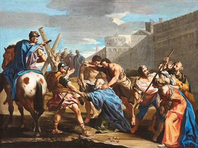 Scene of the martyrdom of Saint Andrew with stuggling figures and a mounted figure on the left. This painting is a late seventeenth- or early eighteenth-century copy after an engraving of Domenichino’s fresco of this subject on the vault of Sant’Andrea della Valle in Rome, painted in 1622–1627. These frescoes were Domenichino’s most extensive Roman commission for which he vied with rival, Giovanni Lanfranco. Saint Andrew was martyred at Patras. He asked that he should be crucified on an ‘X’ shaped cross as he considered himself to be unworthy to die in the same manner as Jesus. More on this painting
