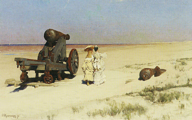 In the present work, two elegant ladies dressed in the latest fashions are seen taking a stroll on a sun-bleached stretch of beach. To this scene of leisured sophistication, Kaemmerer incongruously adds the remains of a rusty canon, pointed in the same direction, on an otherwise empty stretch of beach, suggesting the pair may be visiting a historic stretch of sand where a past naval battle was fought. More on this painting