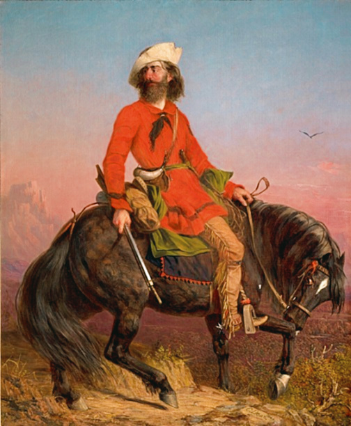 Long Jakes documents America’s first frontier hero, the fur trapper. The fur trade in the American West flourished in the 1830s and was one of the most financially successful industries in America during the first half of the 1800s. The image of the trapper was that of a fiercely independent traveler who led a solitary life. Trappers worked throughout the Rocky Mountains to gather beaver fur, a major commodity (beaver hats were very popular). Trappers were often seen as rebels living outside the limits of society, but more often they were viewed with a sort of heroism, the ideal of the independent American spirit. More on this painting