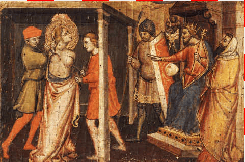 Although the martyrdom of Saint Agatha is authenticated, and her veneration as a saint had spread beyond her native place even in antiquity, there is no reliable information concerning the details of her death. According to Jacobus de Voragine, Legenda Aurea of ca. 1288, having dedicated her virginity to God,[ fifteen-year-old Agatha, from a rich and noble family, rejected the amorous advances of the low-born Roman prefect Quintianus, who then persecuted her for her Christian faith. He sent Agatha to Aphrodisia, the keeper of a brothel. The madam finding her intractable, Quintianus sent for her, argued, threatened, and finally had her put in prison. Amongst the tortures she underwent was the cutting off of her breasts with pincers. After further dramatic confrontations with Quintianus, represented in a sequence of dialogues in her passio that document her fortitude and steadfast devotion, Saint Agatha was then sentenced to be burnt at the stake, but an earthquake saved her from that fate; instead, she was sent to prison where St. Peter the Apostle appeared to her and healed her wounds. Saint Agatha died in prison, according to the Legenda Aurea in “the year of our Lord two hundred and fifty-three in the time of Decius, the emperor of Rome.” More on Saint Agatha of Sicily