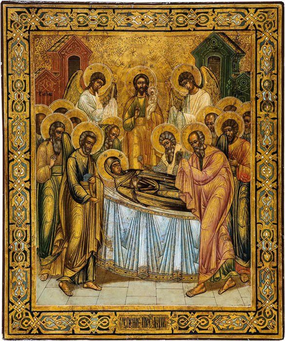 Composite of two Hardwood panels with two back side Sponki. Tempera on gesso, partial gilding. Very fine representation of lying on his deathbed Blessed Mother. To the bed is lined with the Twelve Apostles, partly with the Scriptures, some with censers. Behind the Mother of God is Christ before an aureole. He carries the soul of the Mother of God in the form of a small child. To its sides two angels…