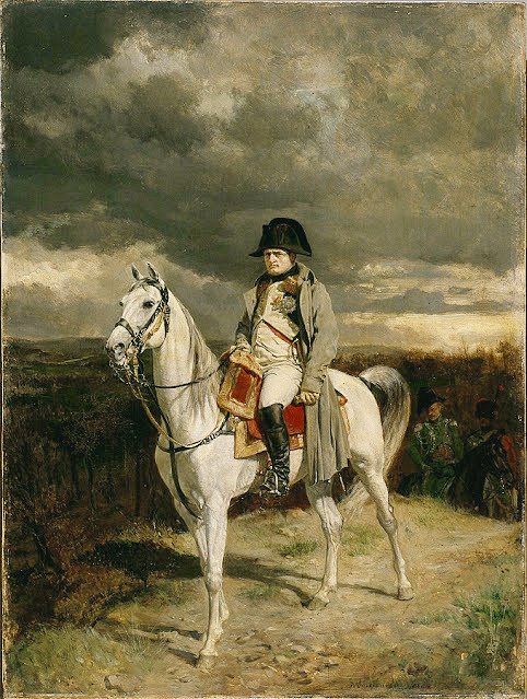 In this small painting commissioned by the subject’s nephew, Prince Napoleon, the emperor is portrayed in a forbidding landscape just after his last, hard-won victory in the 1814 French campaign that was fought at Arcis-sur-Aube, near Troyes: 23,000 French troops withstood the onslaught of 90,000 Austrians, but were unable to capitalize on their victory. More on this painting