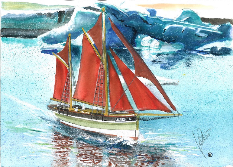In an effort to be accurate with this painting; I found a full set of sails in a fishing village, an ice berg that was friendly enough to hold still and, small model of this type of vessel. The name on the bow is that of our very own Viking Princess and local guide.