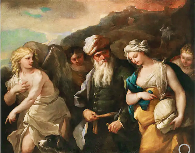 Lot, with a critical, thoughtful look, his head is slightly turned back, followed by one of the daughters, also wearing a white bandana. Her liberally painted upper body already points to the later known sequence of events. More on this painting
