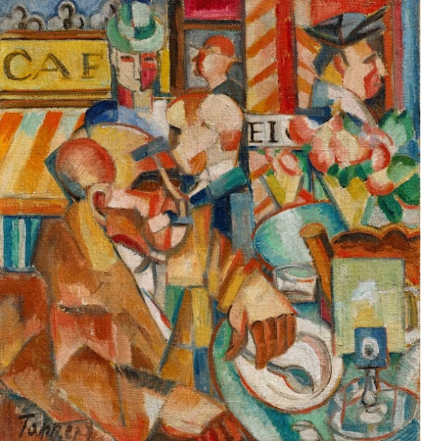Painted in 1917, Café is a fine example of Tappert’s fascination with the subject of café society, which he explored throughout his career, and particularly in the years during the First World War. In taking up themes of the cabaret and the world of entertainment, Tappert reflects the influence of works by Pechstein and Van Dongen, who in turn drew their inspiration from French turn-of-the-century artists such as Toulouse-Lautrec.