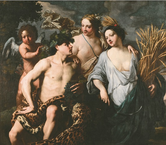 The theme of Sine Cerere et Baccho Friget Venus — literally, ‘without Ceres or Bacchus, Venus would freeze’ — is derived from a line in Act IV of The Eunuch, a Roman farce by a Roman dramatist Terence and explained by the 16th-century humanist Erasmus, this image illustrates the idea that food and drink, the gifts of Ceres and Bacchus, nourish desire, as embodied by Venus. Jan Miel united the three gods with reverberating reflections across the image. More on this image.