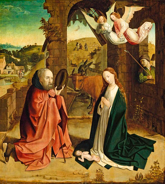 This painted Nativity, which emphasises the humble nature of Christ’s birth, offers an intimate portrayal of the Holy Family. Kneeling in a ruined stable, the Virgin gazes devoutly down at the Christ Child, His small and vulnerable body resting on a fold of her drapery, while Joseph is shown removing his hat as a sign of reverence. Through the arch of the crumbling building, an angel announces Christ’s miraculous birth to shepherds on the hillside, two of whom have already come to witness the event: their strongly characterised faces can be seen peering through a window on the right. The original function of this panel is not known. It may have stood on its own as an aid for private devotion, or functioned as part of a larger ensemble: as the central panel of a triptych; or as one of the panels of a polyptych, depicting scenes from the life of Christ or the Virgin. More on this painting