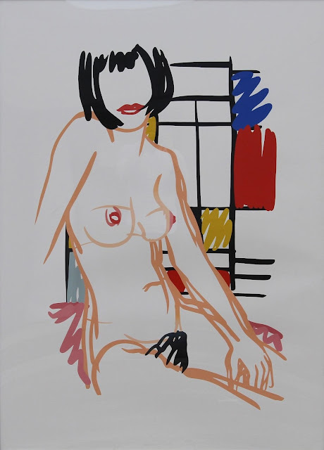 The artist always refrains from developing the facial features of the sitters, as is the case in the work presented here. The attractive model Monica sits undressed and in a lascivious pose in front of one of the modern classics, a work by Piet Mondrian.