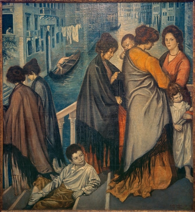 In this large canvas, Bernard combines an almost life-size representation of Venetians in the foreground, with the evocation of the City of the Doges in the background. The airy elegance of the Veronese colors of the women and children dressed in bright colors circulating on the bridgea. The architectural background is almost monochromatic, a kind of silvery blue. The children balance the sculptural silhouettes of the Venetians: a boy gracefully abandons himself to a gentle reverie while a little girl, near the right edge of the painting, seems completely absorbed in the contemplation of her doll. More on this painting