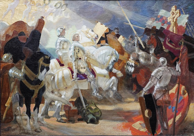 Painted in 1911 it is a figurative landscape of soldiers on the battlefield. The two central characters, the ‘Christian Soldiers’ from the early crusades have halos and ride through the chaos on white horses. Shafts on light with angels illuminate them and also a crucifix. A very powerful Edwardian religious oil painting and an excellent example of O’Salisbury’s work. painted in oil and illuminated in gold leaf.