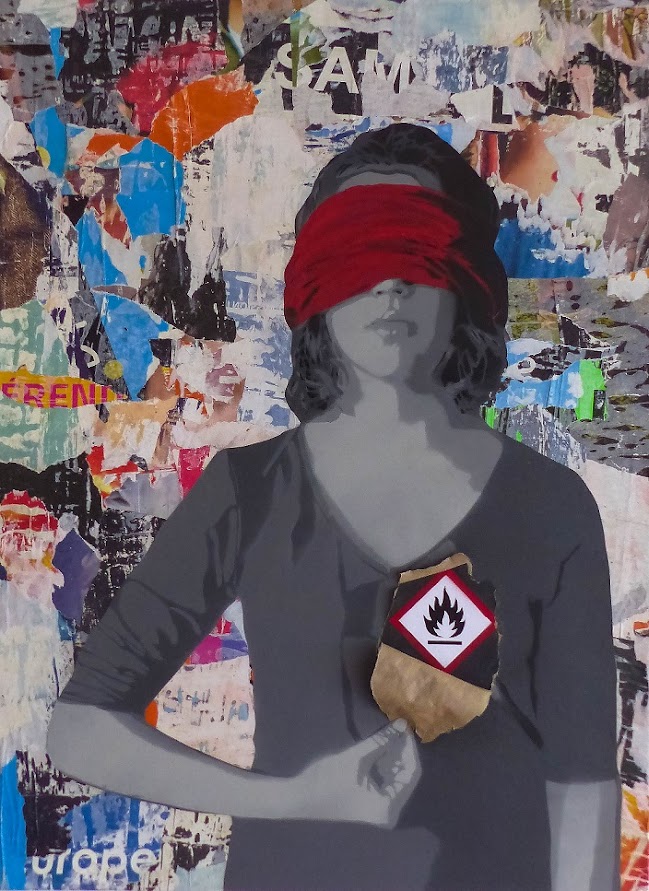 Mixed media: torn posters and a stencil made with a spray can mounted on canvas. During his interventions on the walls, Ender collects posters. Most often, he uses the reverse side of these posters, which thus keep the imprint of the previous poster. These are broken down into more or less large pieces, like an urban puzzle, from which sometimes the trace of a word or an indication emerges.