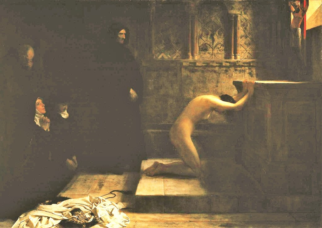 Elizabeth of Hungary (1207-1231) was the wife of Lewis, Landgrave of Thuringia. After his death in 1227 during one of the Crusades, she entered a convent and devoted herself to good works. Before becoming a nun, she passed through a spiritual crisis, torn by the need to renounce the world, and therefore her children, in order to fulfil her desire to serve God. Pressed by a domineering monk, Conrad, whose natural affections had been starved by celibacy, Elizabeth finally vowed that ‘naked and barefoot’ she would follow her ‘naked Lord’. Calderon’s picture shows this moment of self-abasement.