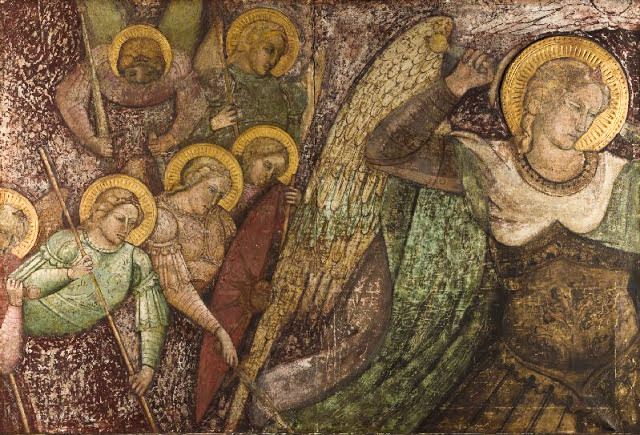 This and other fragments in the Collection are from a large fresco of the ‘Fall of Lucifer’ which was painted for S. Michele Arcangelo in Arezzo, Italy. The scene shows Saint Michael and other angels fighting a war in heaven. The battle took place before God who was originally shown enthroned above, while Lucifer’s agents plunge to earth below. More on this fresco