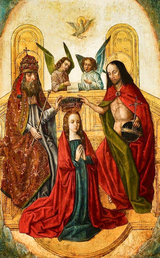 Surrounded by a cloud aureole God the Father (to the left) and Christ (to the right) are sitting on a throne bank with high rests. God the Father is dressed in a coat of brocade and has a tiara on his head. Christ wears a green-lined red coat and holds the globe in his left hand. Together they hold the crown above Mary’s head who is kneeling in between them, her hands clasped for prayer. In this way she is crowned Queen of Heaven. Behind the throne bank there are two angels observing what is going on. In the upper margin of the painting there is the dove of the Holy Spirit which, together with God the Father and Christ represents the Holy Trinity. All of the flesh tones are overall in a good condition. The background shows a condition, which makes presume a former pressed brocade application. The rather curious rests of the throne also support this presumption, because they would fit more organically into such an original context. The entire colouring of the work shows a harmonic character which is typical for this time. The painting might be a section of a formerly large retable. More on this work