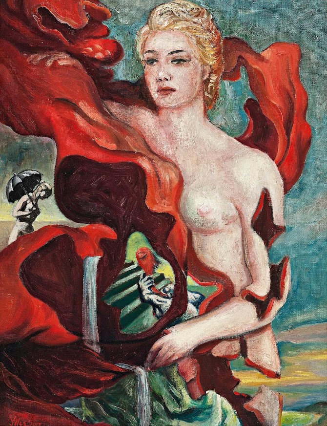 Known as the Father of Australian Surrealism, artist, poet, and critic James Gleeson examines human nature in Surrealist landscapes. His interest in classical figures and mythology inspired by artists like William Blake and El Greco, along with his unease about the fate of humanity as a result of the World Wars, resulted in a body of work featuring an apocalyptic fantasy world. In his alternative reality—as seen in works like Aspiring Echoes (1999)—punishment for historical brutalities are brought to bear in the near future in a mood of disturbing and seductive foreboding. His meticulously rendered and lusciously painted scenes of geological shapes and biomorphic forms merge into the macabre. The artist studied at East Sydney Technical College and the Sydney Teachers’ College. Gleeson’s work is in numerous collections including the Art Gallery of New South Wales, the National Gallery of Victoria, and the National Gallery of Australia. More on James Gleeson